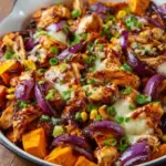 Picture the satisfying crunch of cooked sweet potatoes—the perfect foundation for a delightful mix of tender chicken, crisp red onions, and vibrant corn. Each forkful delivers a heavenly bite, where sweetness meets smokiness, and cheesy goodness melts into a creamy riot of flavors. What could be better for a busy weeknight dinner or an effortless weekend meal with family? This vibrant dish not only delivers on taste but unfurls a tapestry of color that brightens any table setting.