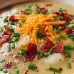 A warm, creamy potato soup that offers comfort and nostalgia with rich flavors and the perfect savory toppings.