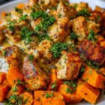 A wholesome dish featuring tender chicken and caramelized sweet potatoes, seasoned to perfection for a comforting meal.