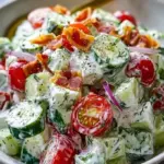 A refreshing salad bursting with flavors from crispy cucumbers, savory bacon, and creamy ranch dressing, perfect for any occasion.