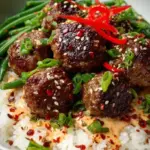 9. Serve: Fluff the coconut rice with a fork and divide it between serving bowls. Arrange the meatballs and green beans on top, drizzling with the delightful firecracker sauce. Garnish with scallion greens, additional toasted sesame seeds, or extra chili crunch for that extra burst of flavor.