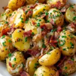 A warm, tangy German Potato Salad featuring baby potatoes, crispy bacon, and a zesty dressing that’s perfect for any occasion.