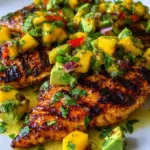 A vibrant dish celebrating summer with grilled chicken topped with a mango and avocado mixture, perfect for any occasion.