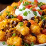 One taste, and you’ll understand why this dish is a family favorite. The crispy top layer of perfectly golden tater tots breaks away to reveal a savory filling—ground beef or turkey, black beans, and vibrant corn, all brought together with zesty salsa and melty cheese. Each mouthful bursts with layers of taste: the slight heat from the taco seasoning, the creaminess of sour cream, and the freshness of green onions, which cut through the richness. Just imagine gathering your loved ones around the table, laughter ringing in the air as they savor every bite. Here you have a simple, satisfying meal that will have your family asking for second helpings.
