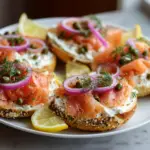 Now for the fun part—garnishing! Add a few fresh lemon slices and a sprinkle of dill on top. Not only does this add a burst of color, but the lemon brightens the flavors, while the dill brings a fresh herbaceous note. It’s all about presentation, and this step makes your bagels look as good as they taste!