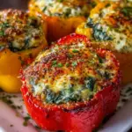The vibrant sound of sizzling vegetables wafts through the air, mingling with the inviting aroma of garlic and herbs, creating a warm atmosphere that draws everyone into the kitchen. You can almost hear the laughter and chatter around the table, as friends and family anticipate the delicious feast that awaits them. Nestled amidst the hustle and bustle are the star of the show: overflowing, luscious spinach ricotta stuffed peppers, their bright colors radiating happiness and promise. The moment you cut into one, you can practically see the creamy filling gently spilling out, ready to envelop your taste buds in a comforting embrace.