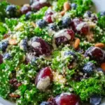 In a large bowl, combine chopped kale, blueberries, halved grapes, and dried cherries. The colors should excite your eyes, with each ingredient shining in its own right.