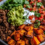 Assembly time: Once the sweet potatoes are roasted to perfection, it’s time to build your taco bowl. Divide the sweet potato cubes into bowls, then layer on the cooked beef. Top generously with pico de gallo, delightful scoops of guacamole, and a swirl of sour cream for extra richness.